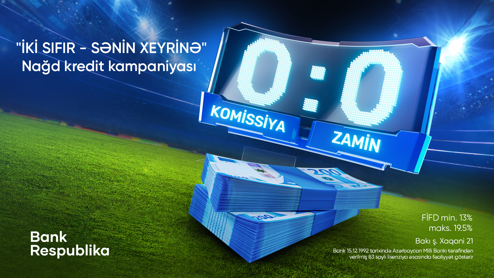 O zaman “Bank Respublika”nın start verdiyi yeni “İki sıfır - sənin xeyrinə” nağd kredit kampaniyasından faydalanmağa tələsin! Kampaniyası çərçivəsində Siz nağd kreditləri 0 komissiya və 0 zaminlə götürə biləcək, iki dəfə qazanmış olacaqsınız.