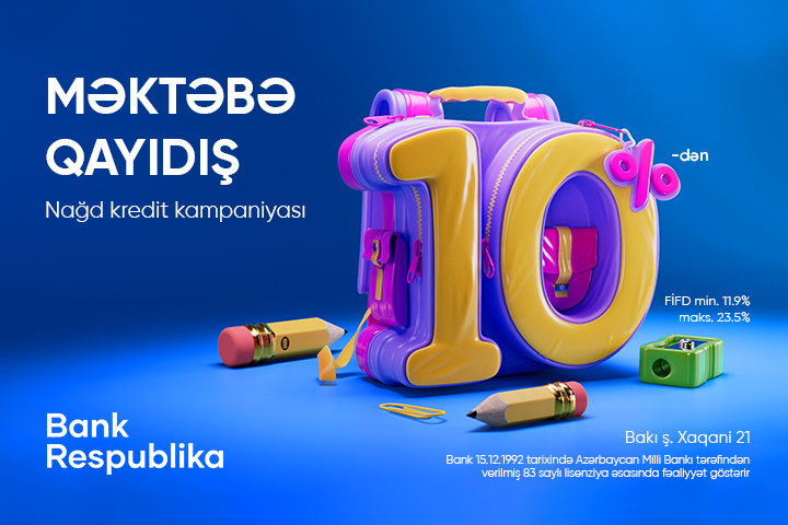 Bakı, 04 sentyabr 2024. Müştərilərini hər zaman maraqlı və sərfəli kampaniyalarla sevindirən Bank Respublika, yeni tədris ili öncəsi “Məktəbə qayıdış” adlı sərfəli nağd kredit kampaniyasına start verir!