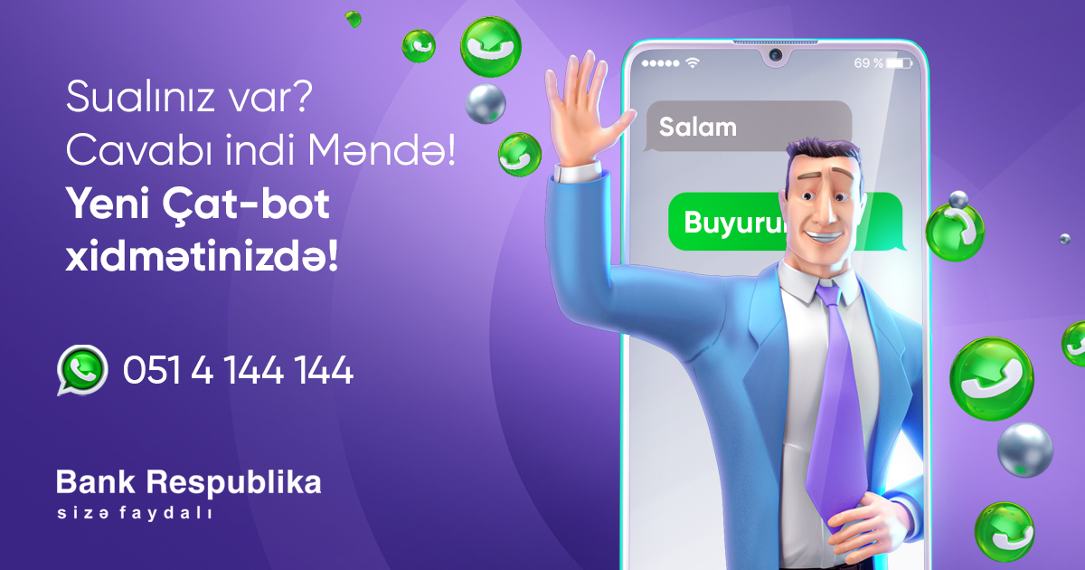 «Мы очень рады, что впервые в нашей стране Банк Республика запустил чат-бот на самом популярном мессенджере в Азербайджане WhatsApp. С новым чат-ботом наши клиенты смогут легко и просто найти ответы на свои вопросы сэкономив время! На начальном этапе нашим клиентам будет предоставлена полностью автоматизированная поддержка наиболее востребованных продуктов при обращении в банк – заявка на кредит и онлайн заказ пластиковых карт. На следующем этапе база данных чат-бота будет еще более расширена на основе запросов клиентов, что создаст возможность расширить список предоставляемых продуктов и услуг на платформе чат-бота ». отметил Анар Гамидов, Директор Департамента Розничных Продаж Банка Республика.